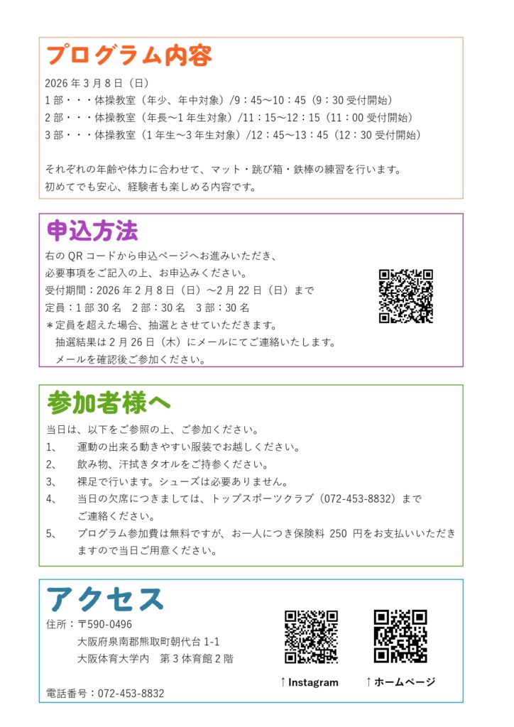 ・3部/対象:1年生~3年生(体操教室)12:45~13:45